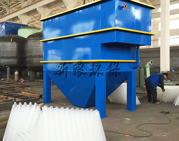 一體化絮凝原理污水沉淀設備主要由多排多層V型管傾斜組合而成。使用時,由于斜置的V型管壁的作用,各處沉淀到V型管內壁上的泥渣均近距離滑向V型管的底角處并沿底角線自動向下滑出管腔,凈化后的清水從沉淀器上口排出,既有利于泥渣與上向流的進水拉開距離,避免了泥渣再次泛起的不利影響,又有利于將集中在V型管底角的泥渣自動沿底角線向下滑出管腔。改善了泥、水分離條件,能有效提高沉淀效果。具有結構簡單合理、沉淀效率高、出水水質好,運行穩定可靠、工程造價低等.