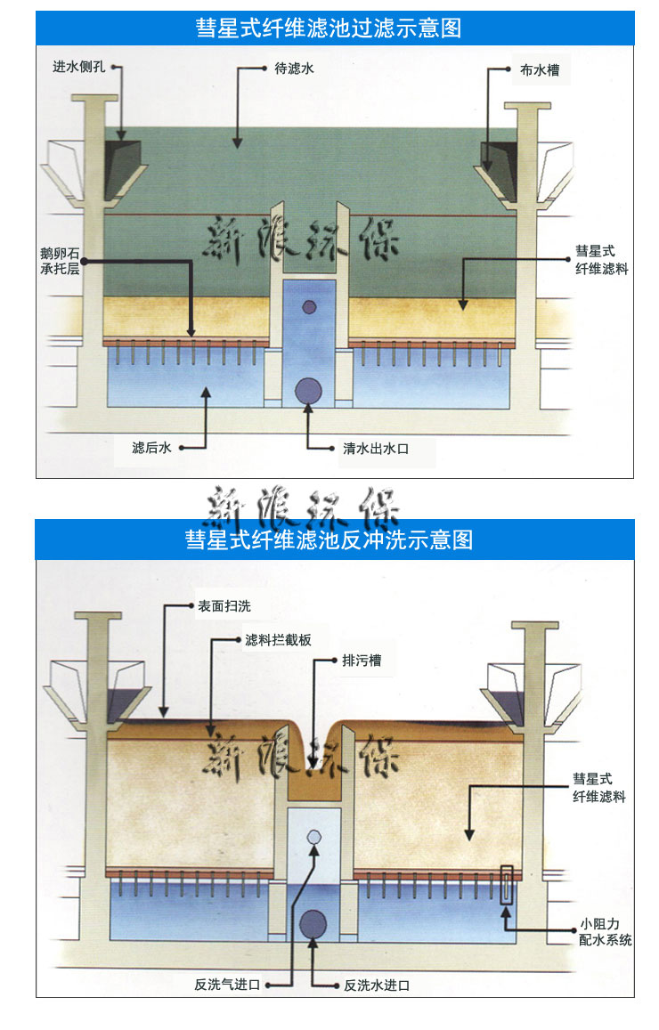 彗星式纖維濾池是一種重力式深層過濾池,它采用彗星式纖維濾料,小阻力配水布,氣水反沖,變水位或恒水位過濾方式,是目前深層過濾池中去除懸浮物較高效的過濾技術(shù)。
